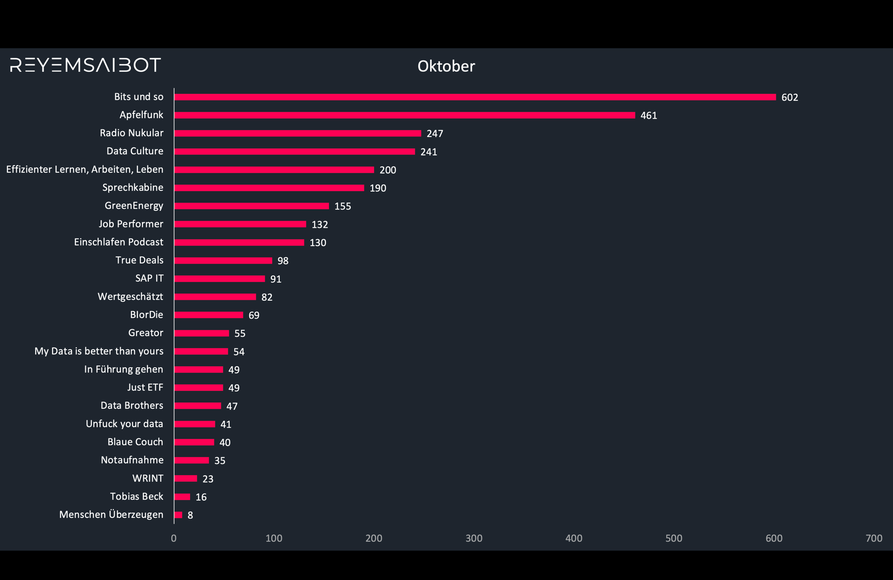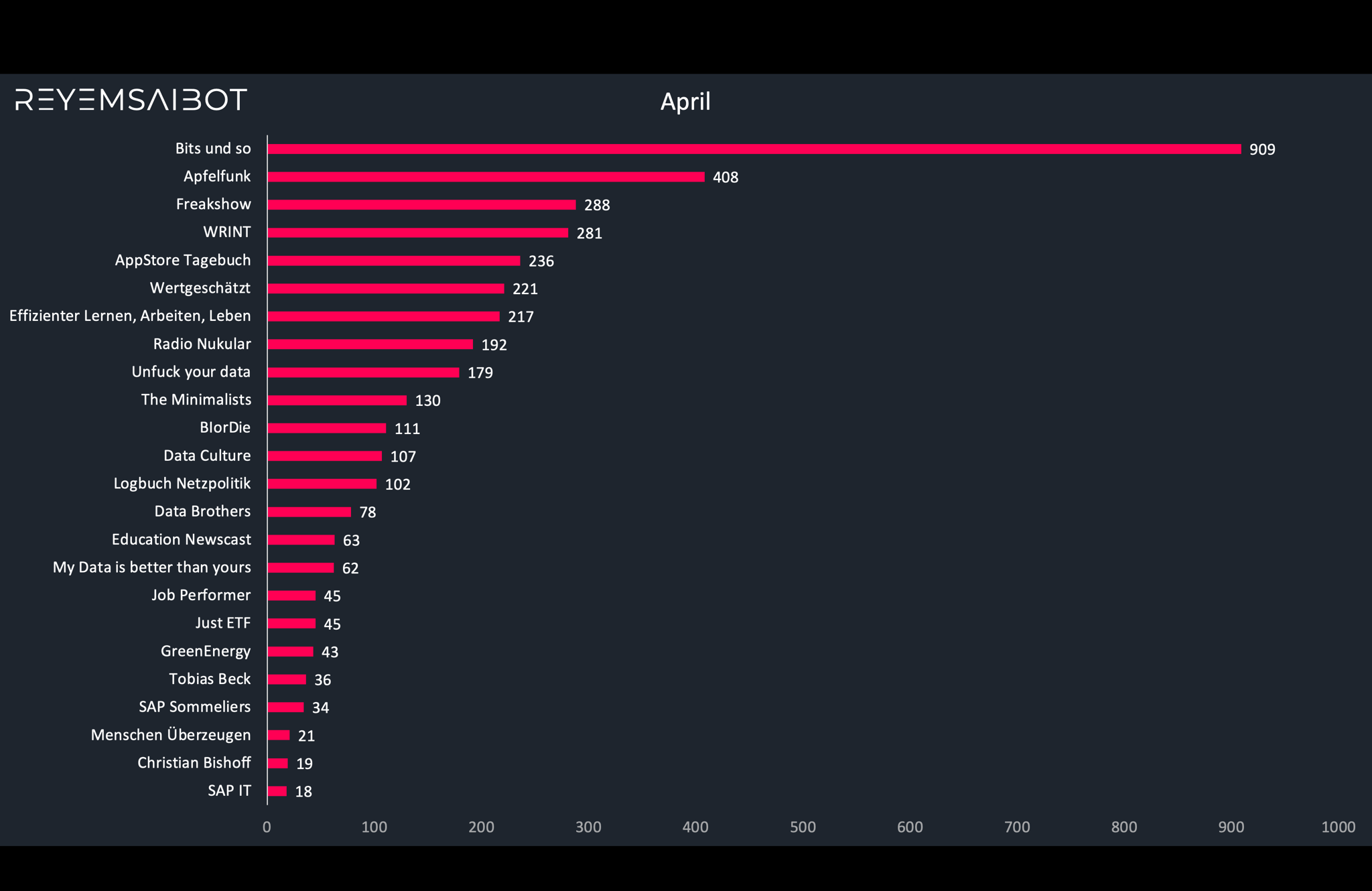 In 2023, I read 13 books, listened to 36030 minutes podcasts. These are over 25 days in 45 different podcasts. My most played podcasts are Bits und so, Apfelfunk, WRINT, Wertgeschätzt and My Data is better than yours A detailed monthly analysis can be found in the following pictures.